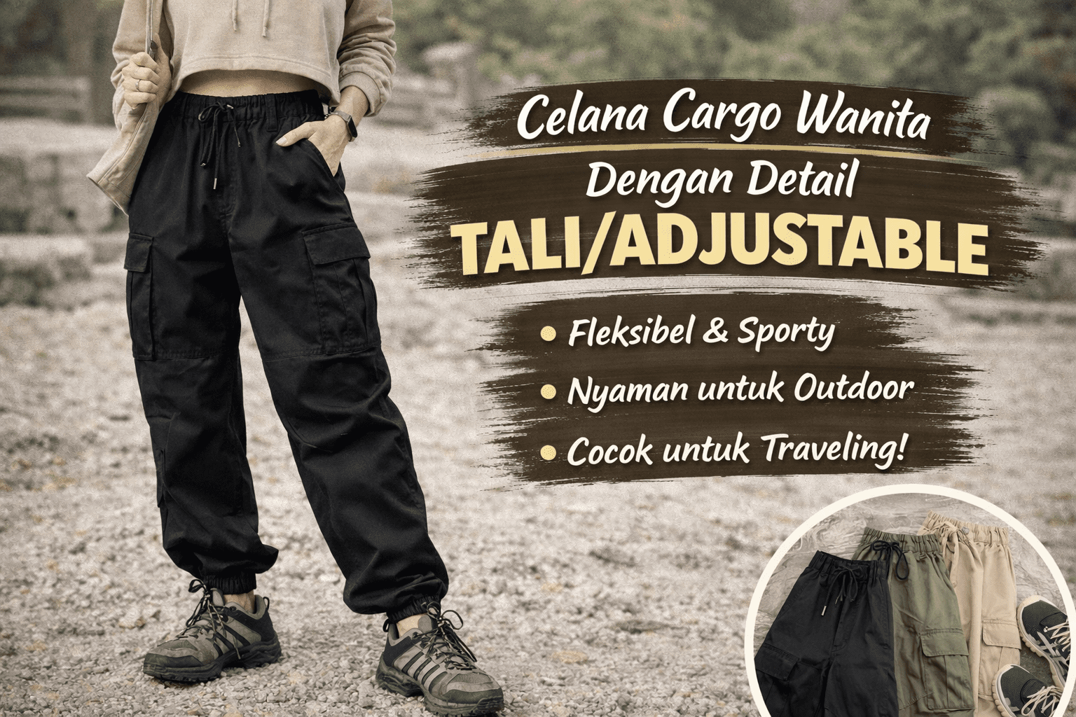 4. Celana Cargo Wanita dengan Detail Tali atau Adjustable